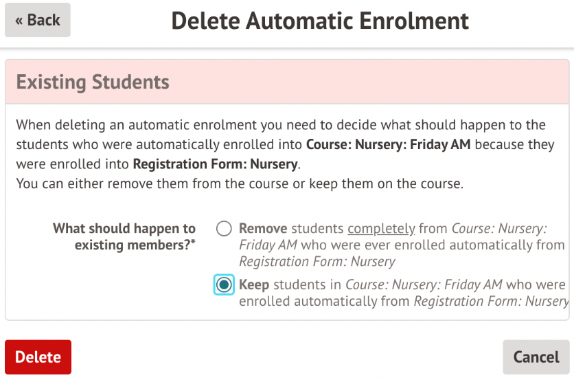 If you wish to move away from using Automatic Enrolments and move to Manual enrolment, the existing automatic enrolment for the students needs to be deleted. When you do so, please confirm that the pupils need to be kept within the course.