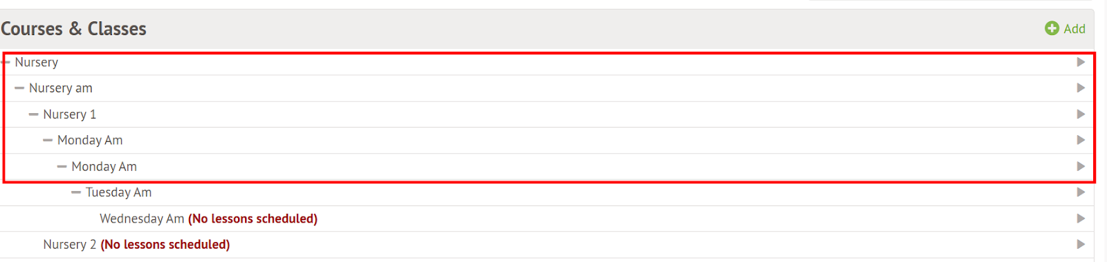 - Head to School > Programmes Courses, and if your Nursery class looks like the below, i.e. Tuesday courses sat within a Monday module. This will need to be adjusted.