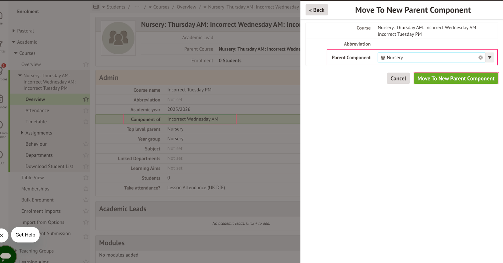 The course will then revert to the former Component of: Nursery section and be included in the list shown when you click the + next to the Nursery icon.