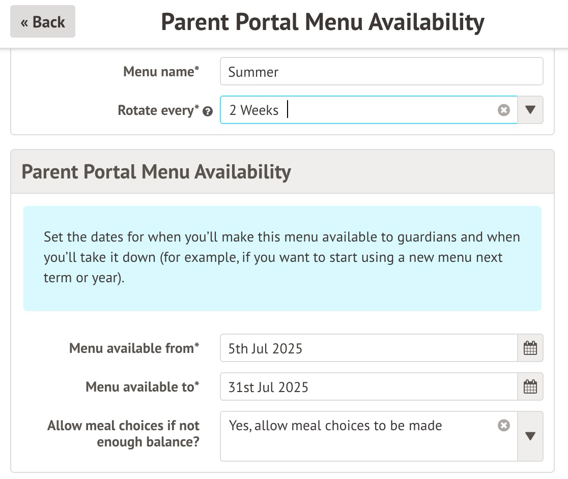 When setting up your Rotating Meal Menu (see this article: Rotating Meal Menus: Introduction), you will be able to prevent parents and guardians from booking meal choices for their child if they do not have enough balance in their Meals account.