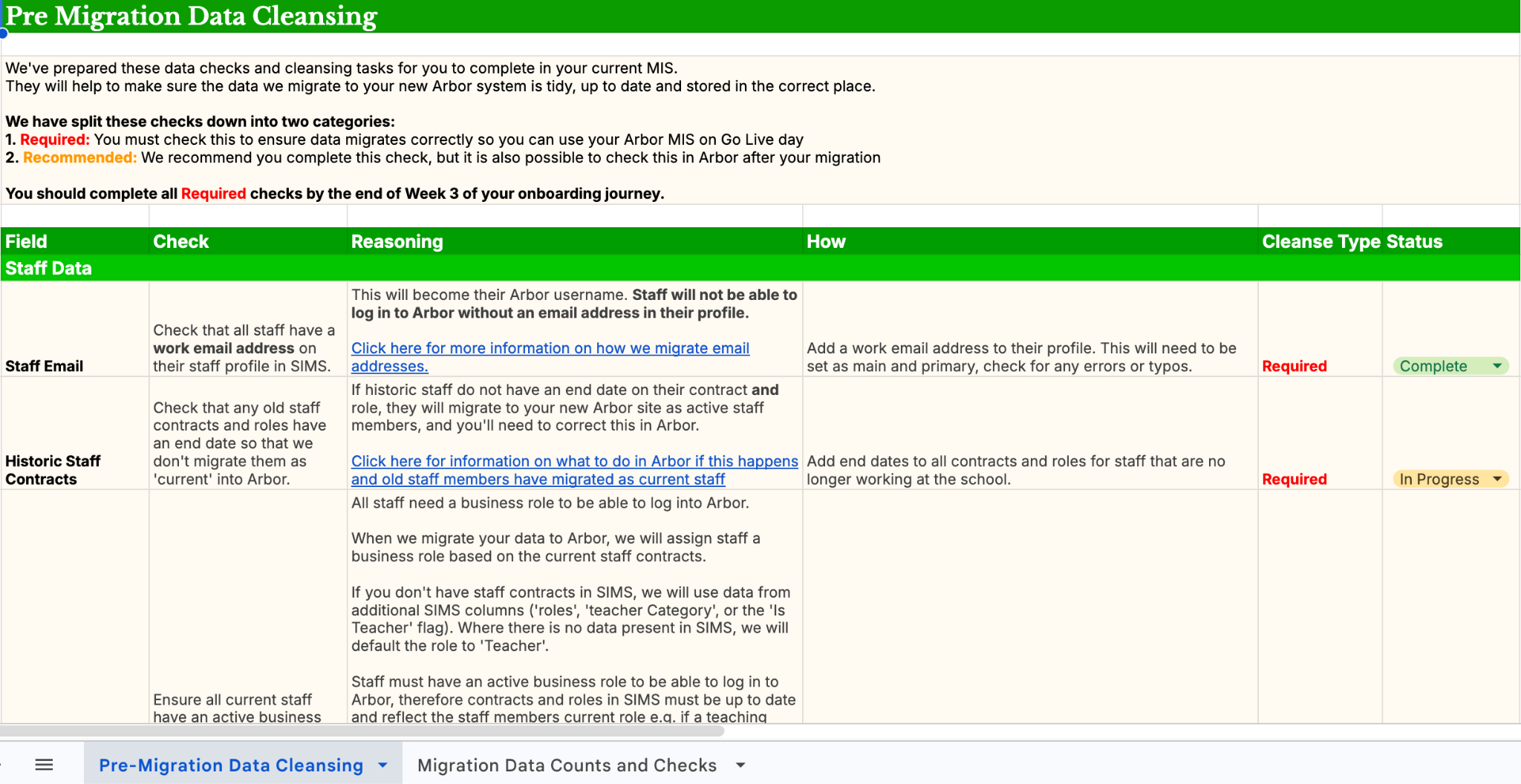 The Data Cleansing and Counts Pack is essential to ensuring your data migrates over correctly to Arbor. It is split into two main phases: