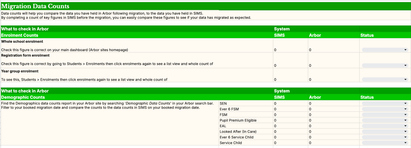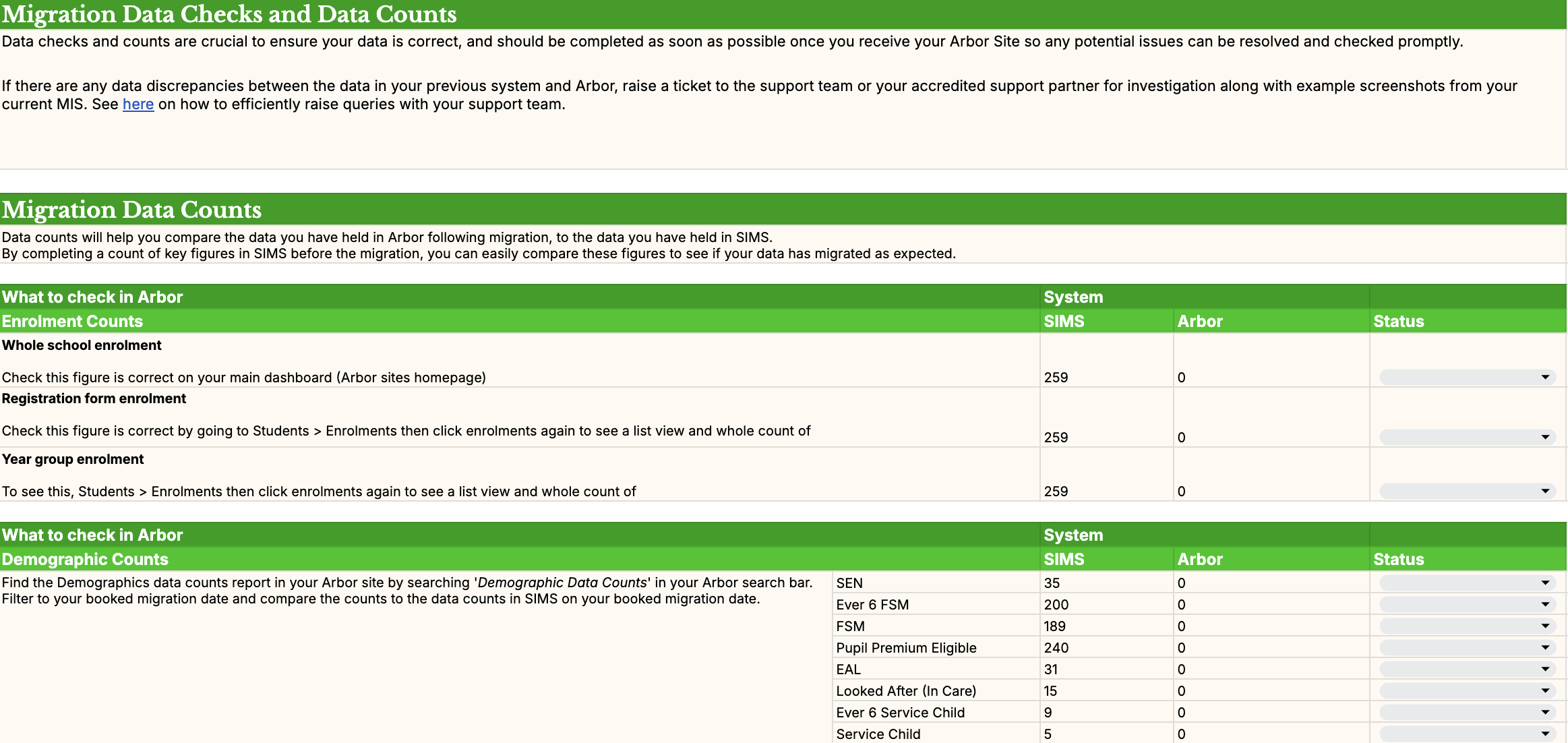 Data Counts and Checks: Comparing your current MIS data against the data in your Arbor site following migration, you’ll have the help of in site Arbor reports to check whether everything arrived correctly.