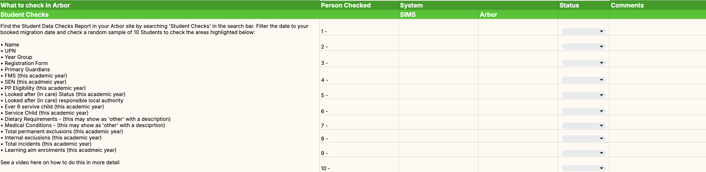 Steps 3: If the SIMS/ Bromcom and Arbor columns match, mark the status as Complete, if there is a discrepancy, follow the steps below.