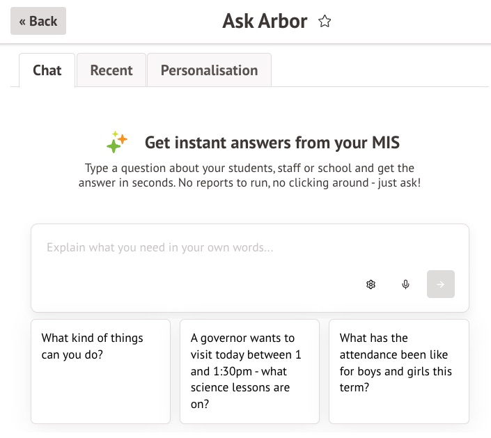Ask Arbor is your AI-assistant for Arbor. Anyone with permission can consult Ask Arbor with a single click from any page in the MIS. This guide takes you through how to open Ask Arbor so you can start harnessing the power of the AI in Arbor.