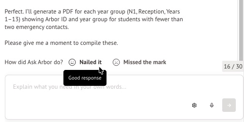 Ask Arbor will reply with what it has found or has actioned for you. Or, if anything needs to be clarified before Ask Arbor can give a confident response, Ask Arbor will ask you a follow-up question. You can continue the conversation by sending another text or voice message until you reach the limit of 30 messages per conversation.