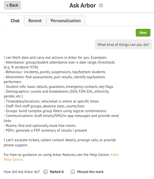 You may need your Arbor AI administrator to give you permission to access Ask Arbor. While any staff member can access Ask Arbor in principle, you do need to be granted permission to do so. Admins can find more on managing Ask Arbor and Arbor AI permissions here.