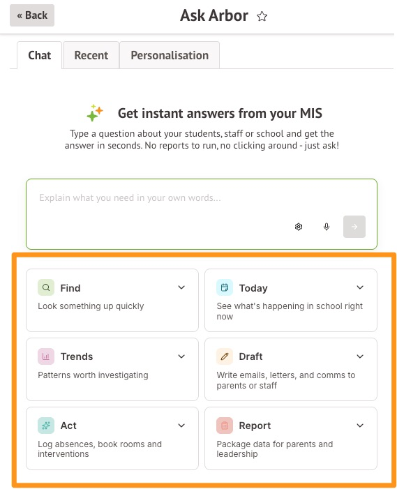 When you open Ask Arbor you immediately see action-based categories to help focus the AI on exactly what you want to achieve without you having to craft the perfect prompt.
