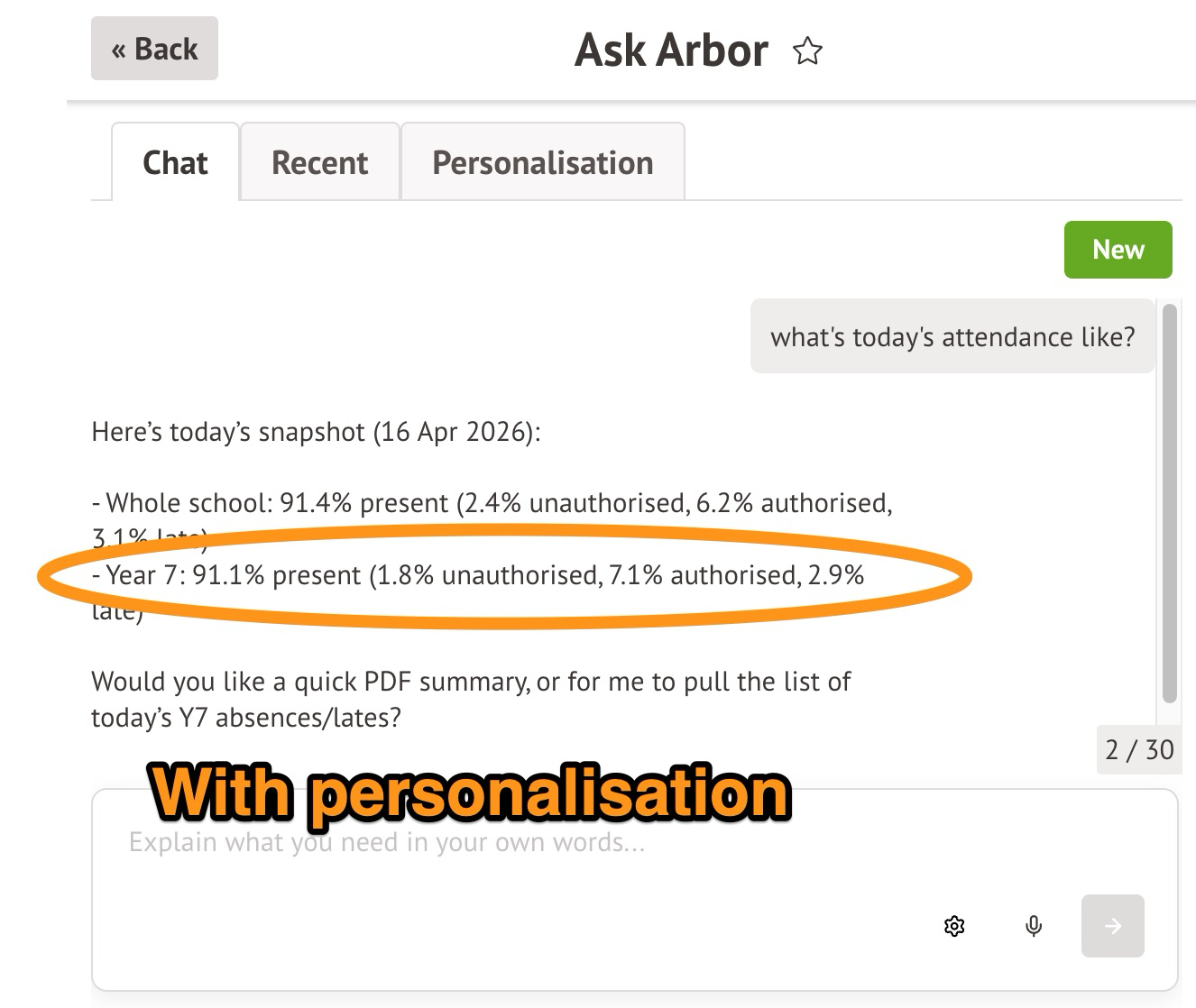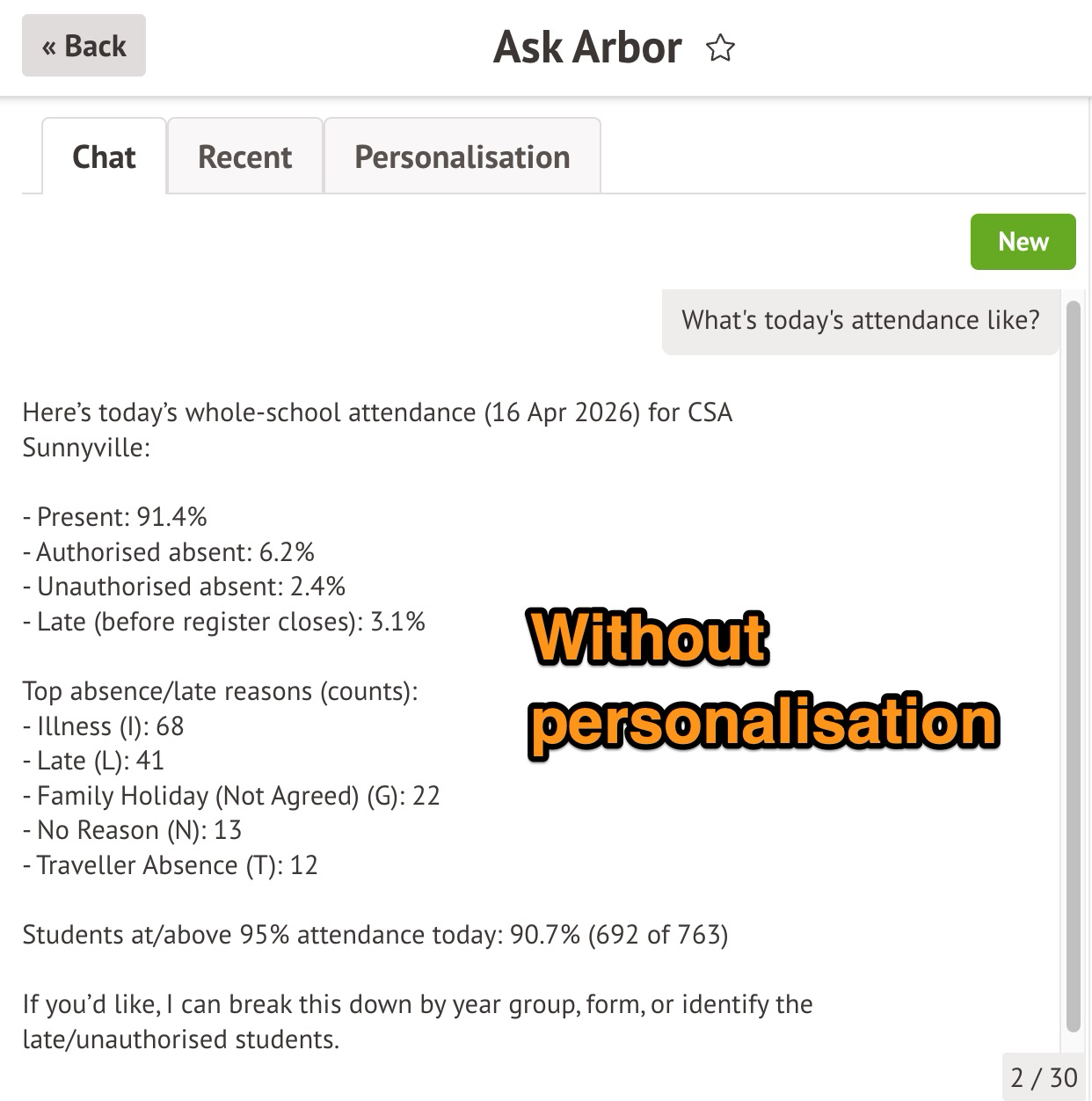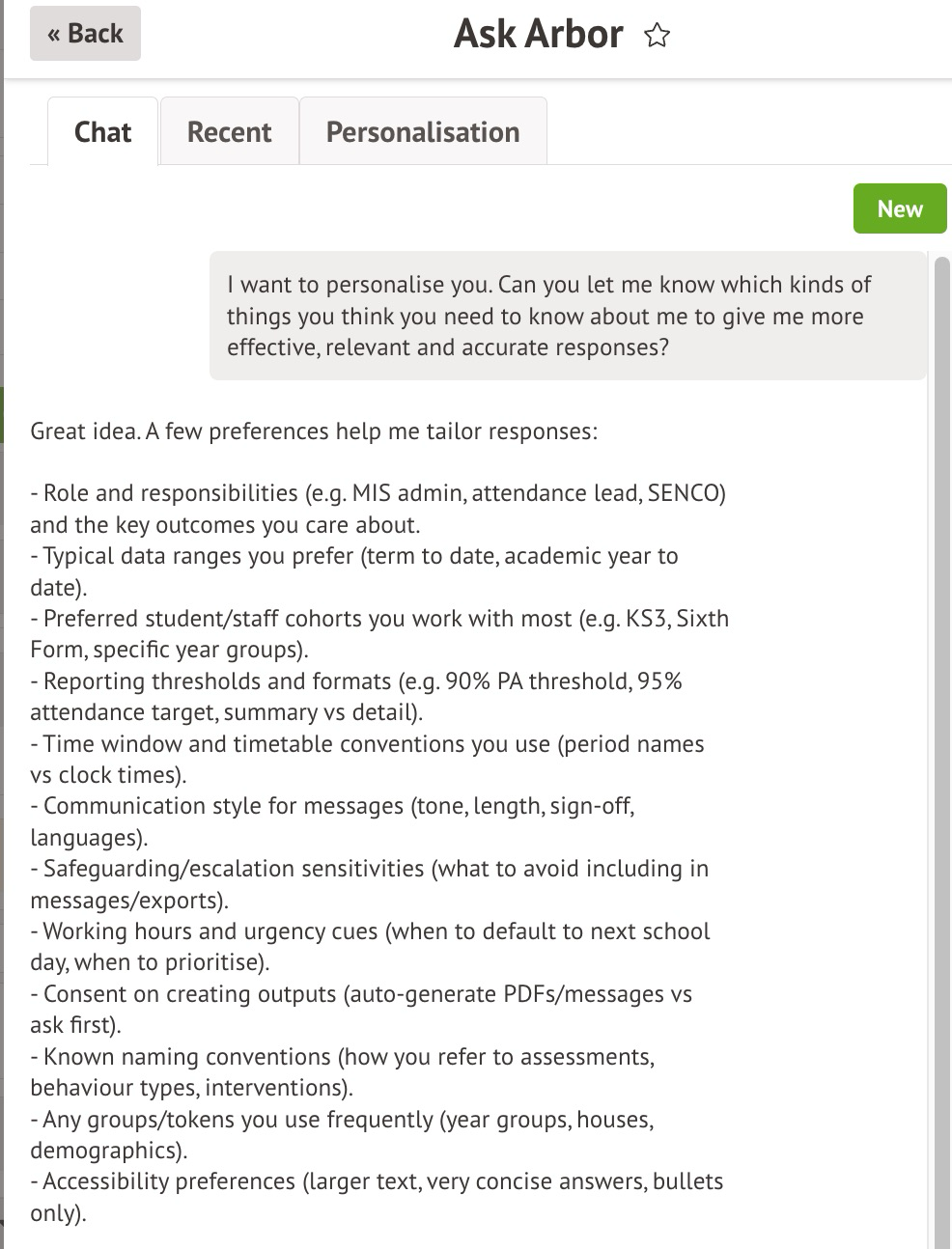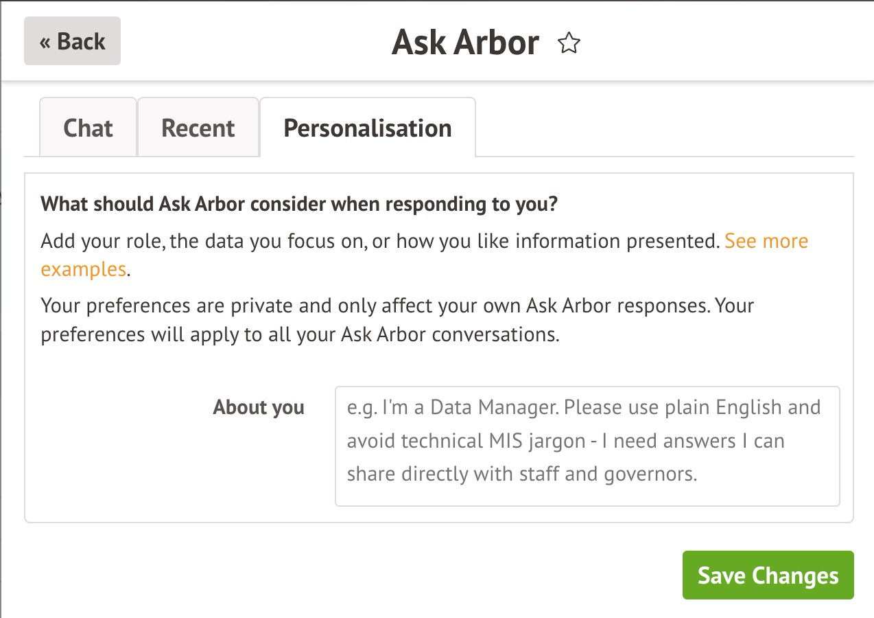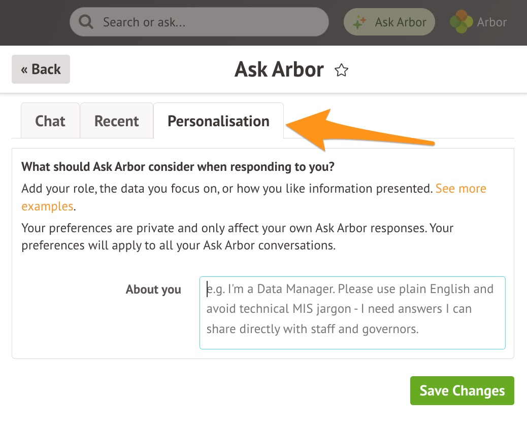 You can add things like your role, the data you focus on, or how you like information presented. Your preferences are private and only affect your own Ask Arbor responses. The personalisation you set will apply to all of your Ask Arbor conversations.