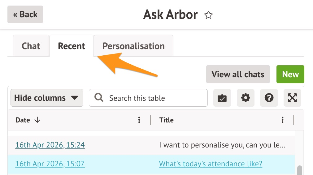 So, to help you maintain your flow and avoid having to ask the same questions repeatedly, you can surface your recent chat history directly in the Ask Arbor slide-over.