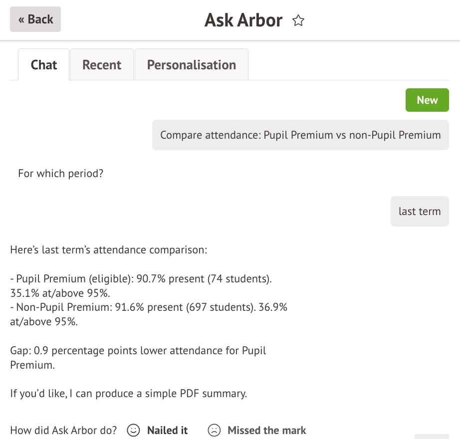 - Be specific — the more detail you include (year group, subject, date range), the more accurate the response.