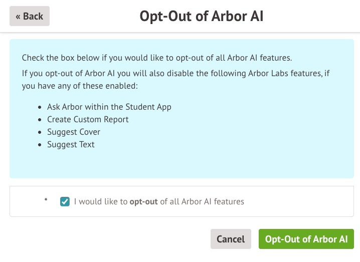 To opt back into Arbor AI, select the Opt-Out of Arbor AI row on the same page you opted out.