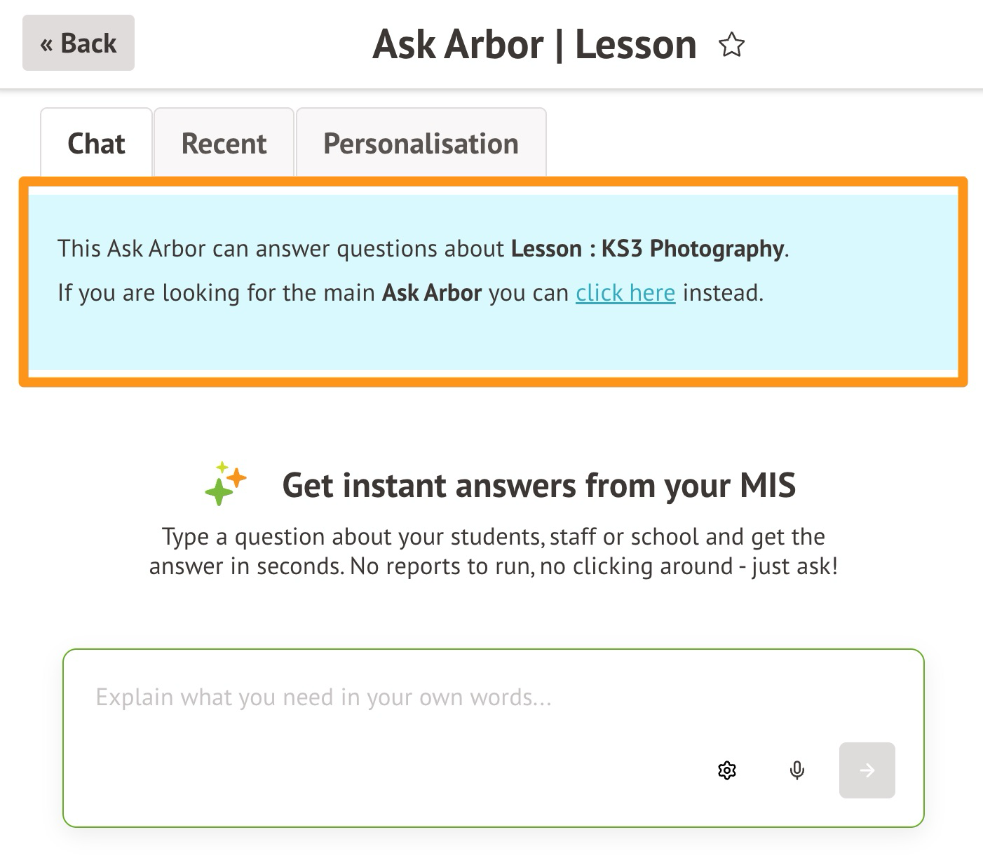 If you cannot see the Ask Arbor button or specific AI features mentioned in this guide, but believe you need access to save time in your role, please contact your school's admin team and refer them to this guidance on managing AI permissions.