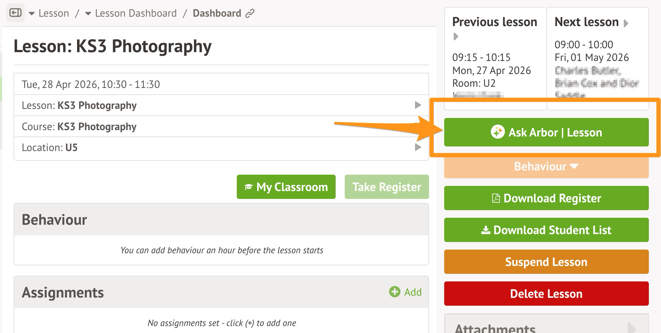 To open one of these assistants, navigate to your lesson dashboard, year group or registration form page (for example, by going to My Items > My Classes > [Select your class] or by opening a Lesson Dashboard from your calendar) and click the green Ask Arbor button in the right-hand menu or the top-right corner.