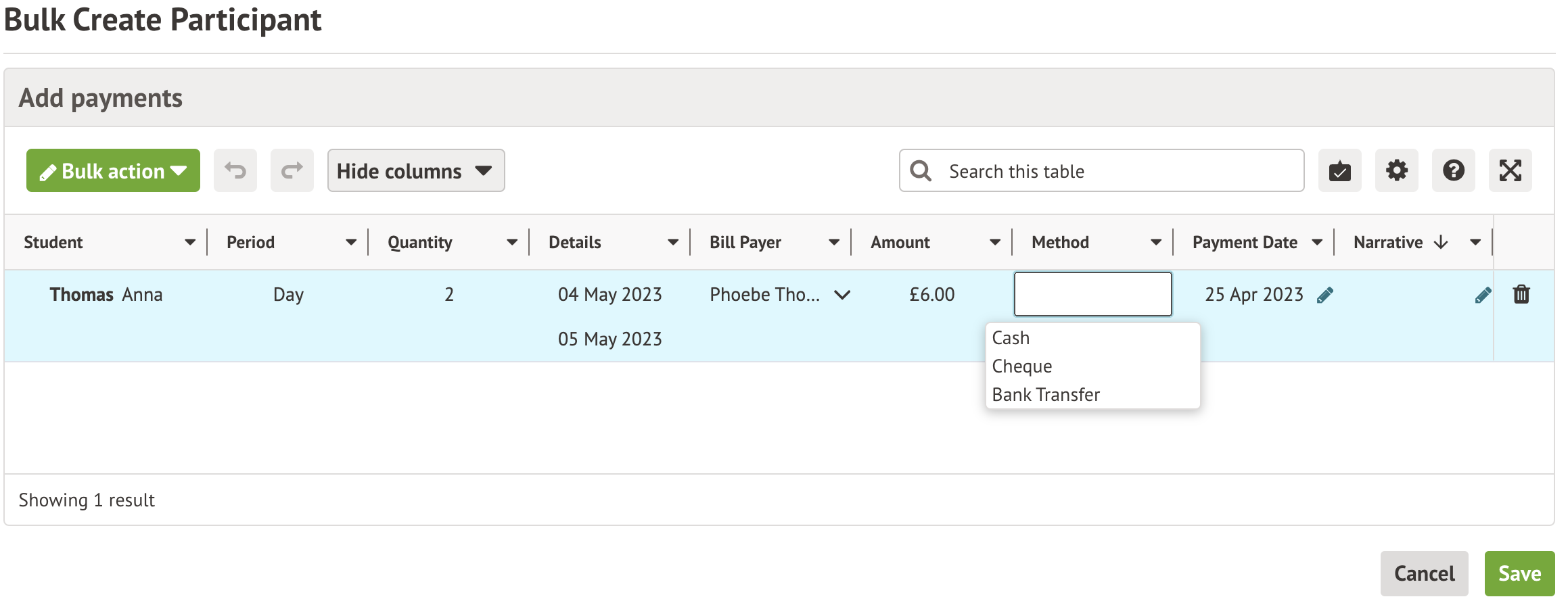 In this instance add the student to the club in the same way as before but leave the Method column blank when on the Bulk Create Participant page. Then instead of Save select Cancel.