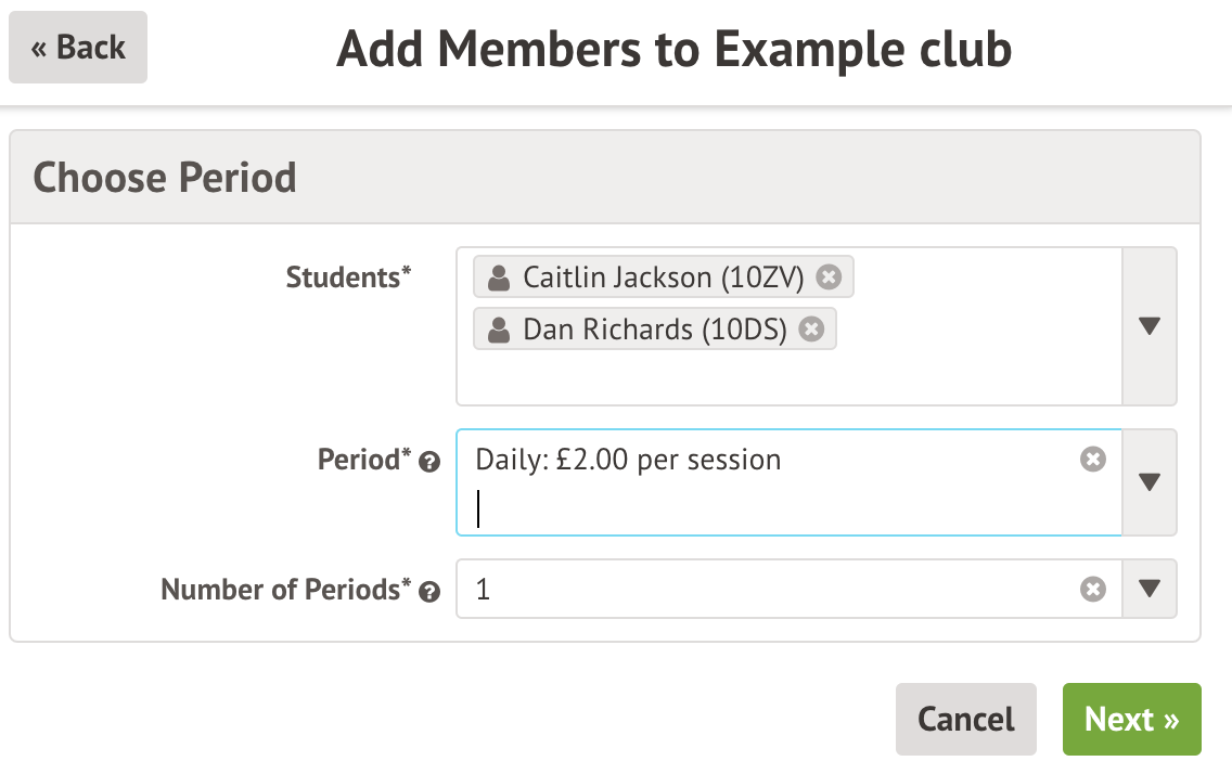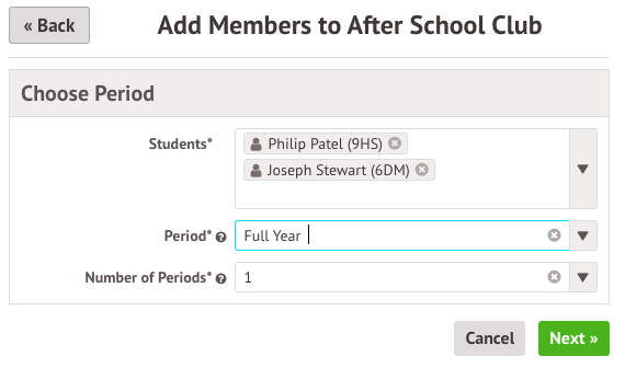 You can select which students to add, what period to sign them up to (E.g. if you have set up daily, weekly periods etc.) and the number of these periods to sign them up for.