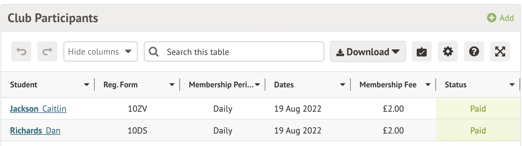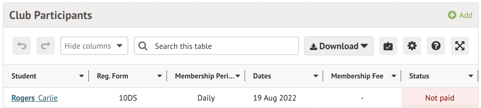 For a paid club, one you have set up membership prices, click +Add to register these students for the club.
