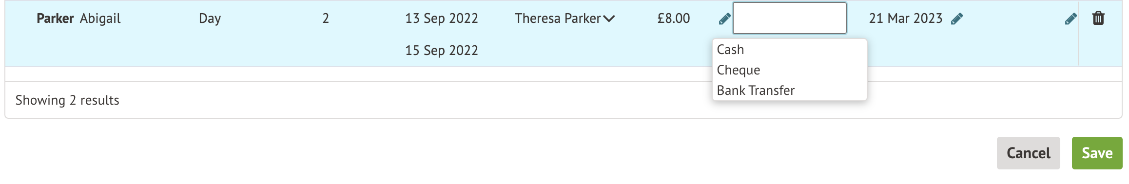 You can then add how they have paid in the Method box. Please note, only Cash, Cheque or Bank Transfer can be logged here.