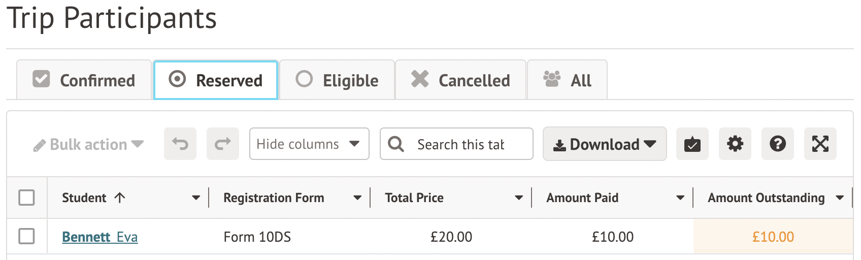 For a paid trip, once you have set up prices, you can sign students up for the trip which also creates an invoice. Top Tip: Students with an invoice will have their name underlined and turned into a hyperlink.