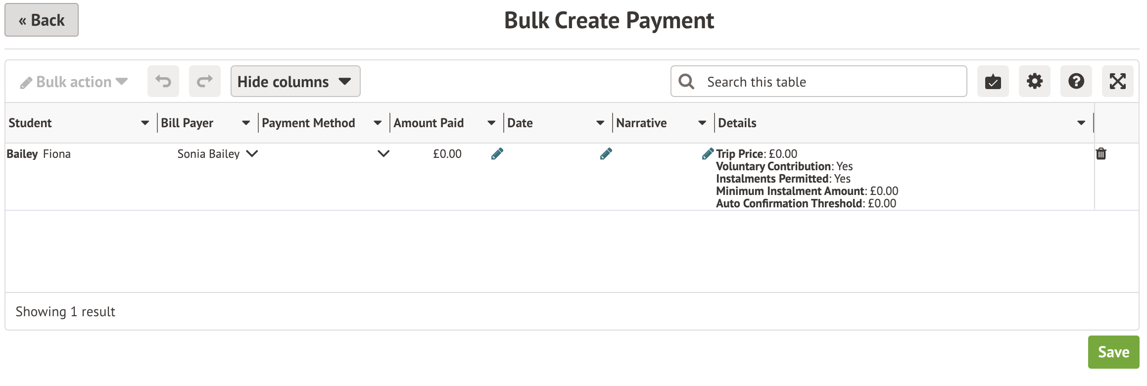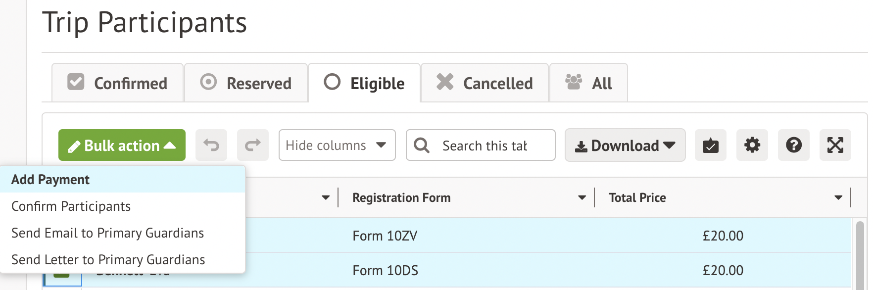 Go to the Eligible tab. Select all the students to sign up for the trip, then click the Bulk action button and select Add Payment.