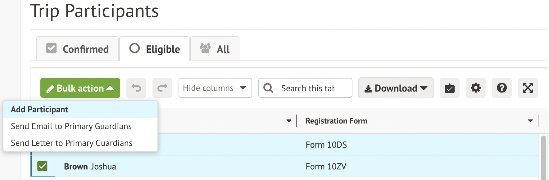 For a free trip, go to the Eligible tab. Select all the students to sign up for the trip, then click the Bulk action button and select Add Participant.