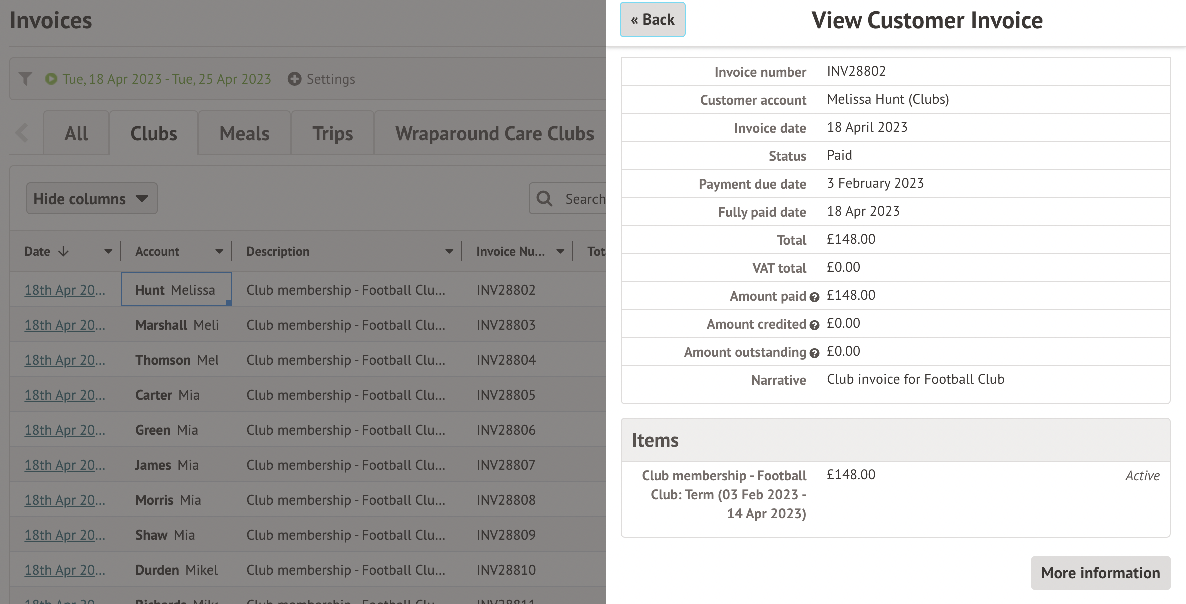 To reconcile payments and refunds made against the invoice created when the memberships were booked, you can go to School > Payments > Accounts > Invoices > Clubs. Select the invoice.