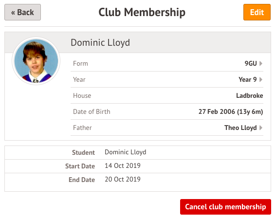 First, go to School > Activities > Clubs and select the club. Scroll down to the Club Participants section. Click the membership you want to cancel.