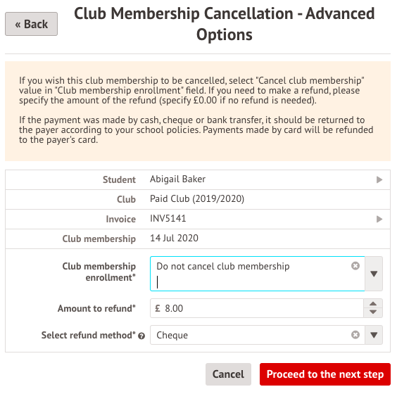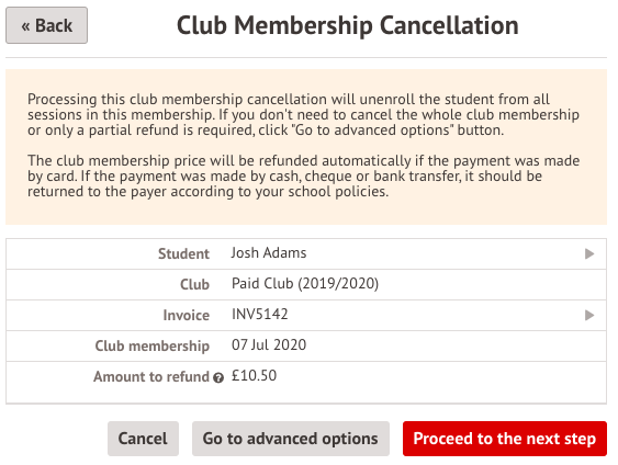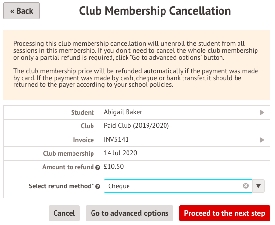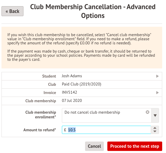 If you selected Go to advanced options, you can select how much to refund, and whether to cancel the club membership or not.