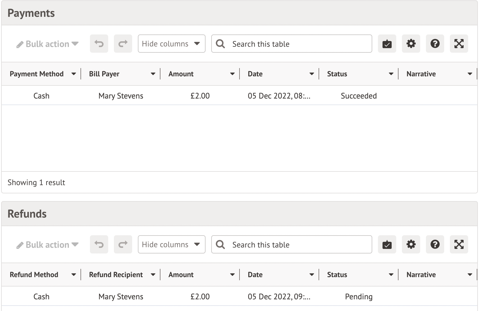 Payments made via Cash, Cheque or Bank Transfer can only be refunded via Cash or Check, and payments made via Card can only be refunded by Card.