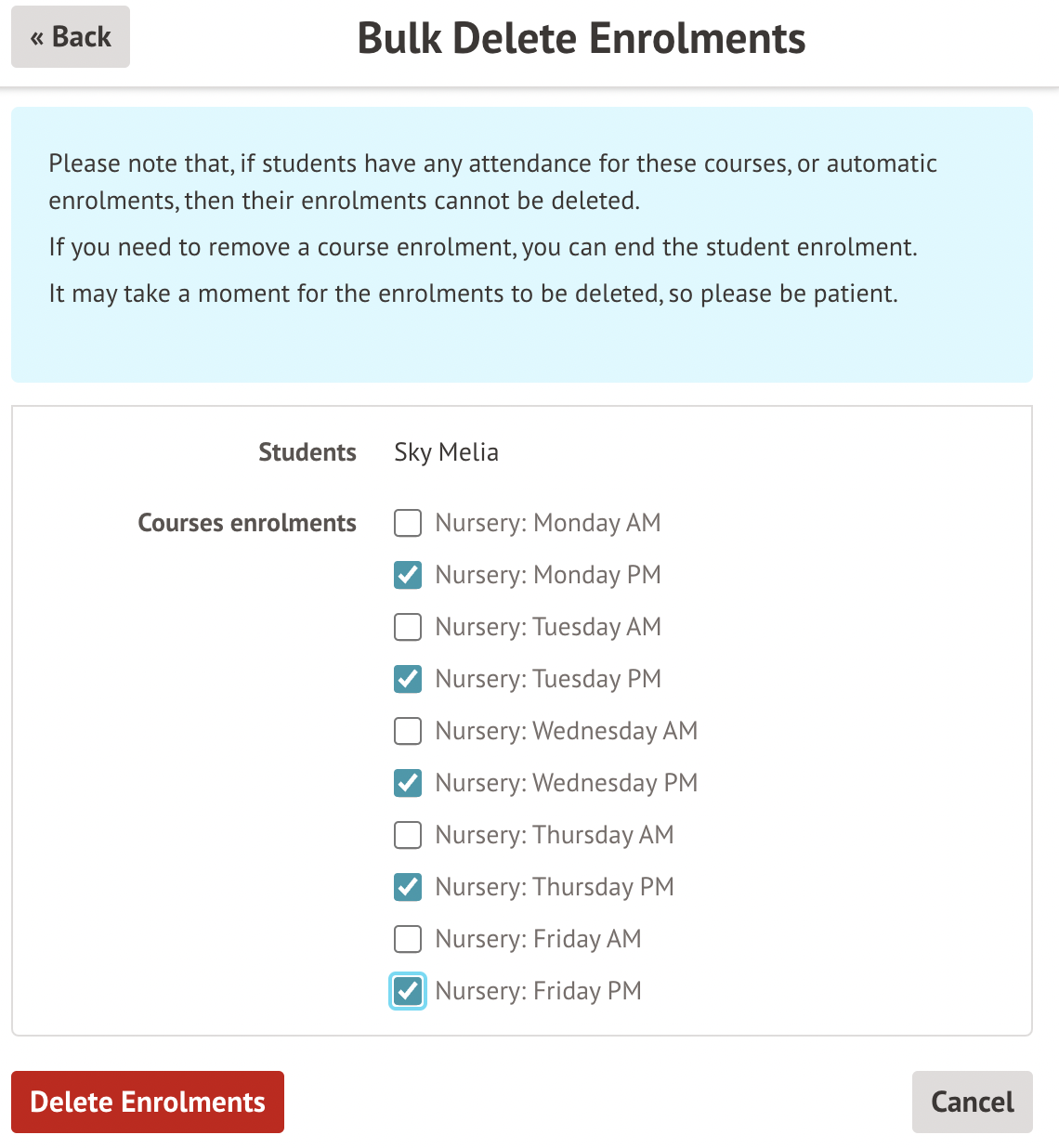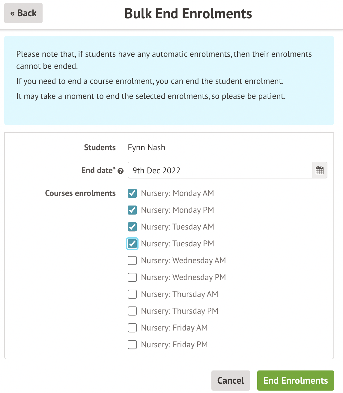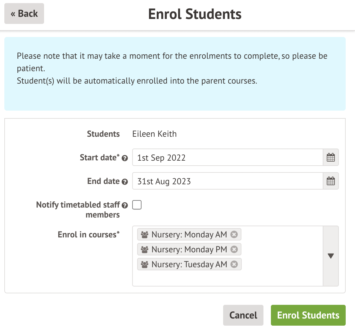 You’ll need to add enrolments for your nursery students. Whenever you have a new student, you’ll need to repeat this process to enrol them.