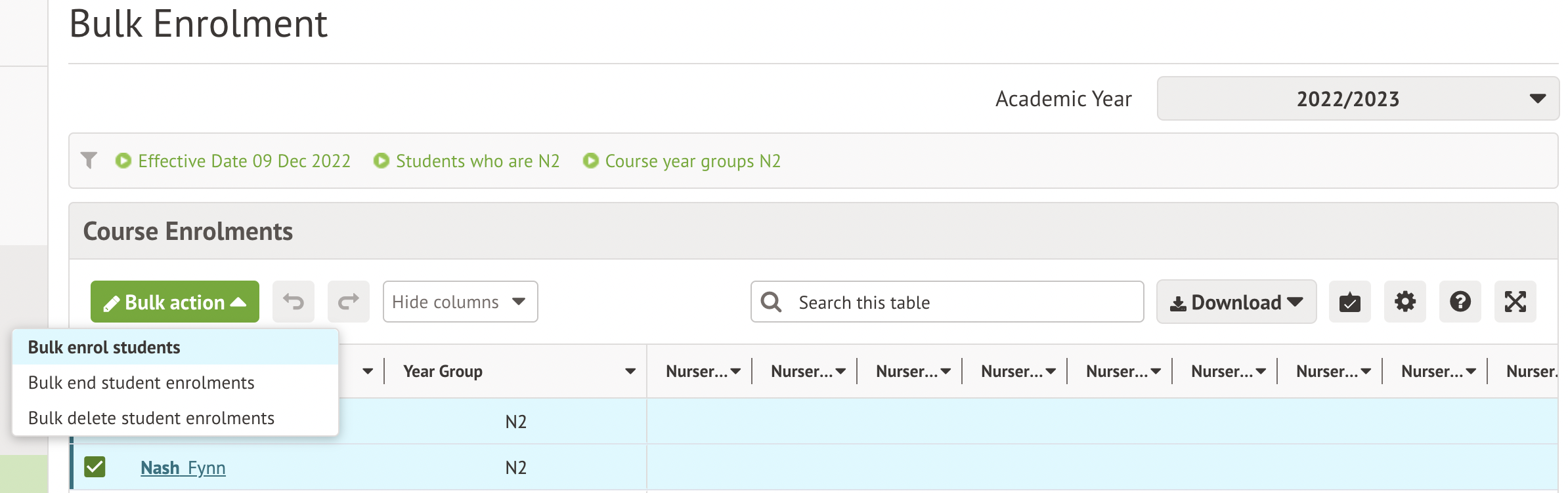 Next, go to Students > Enrolment > Academic > Courses > Bulk Enrolment.