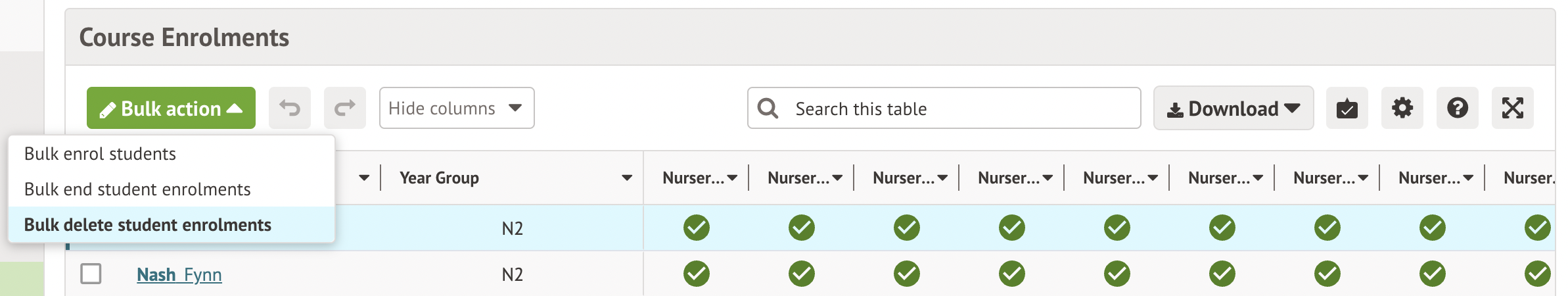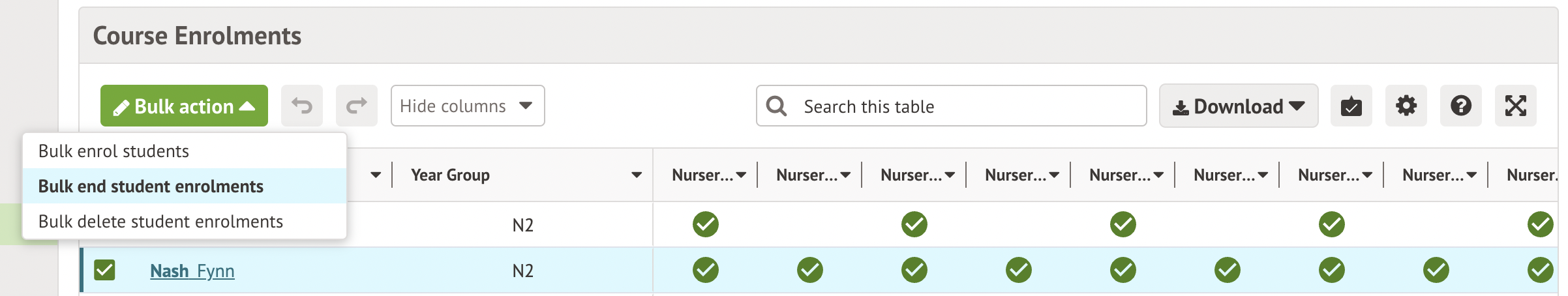 Tick the boxes next to all the students whom you want to change enrolments for, then click the Bulk action button and select Bulk end student enrolments.