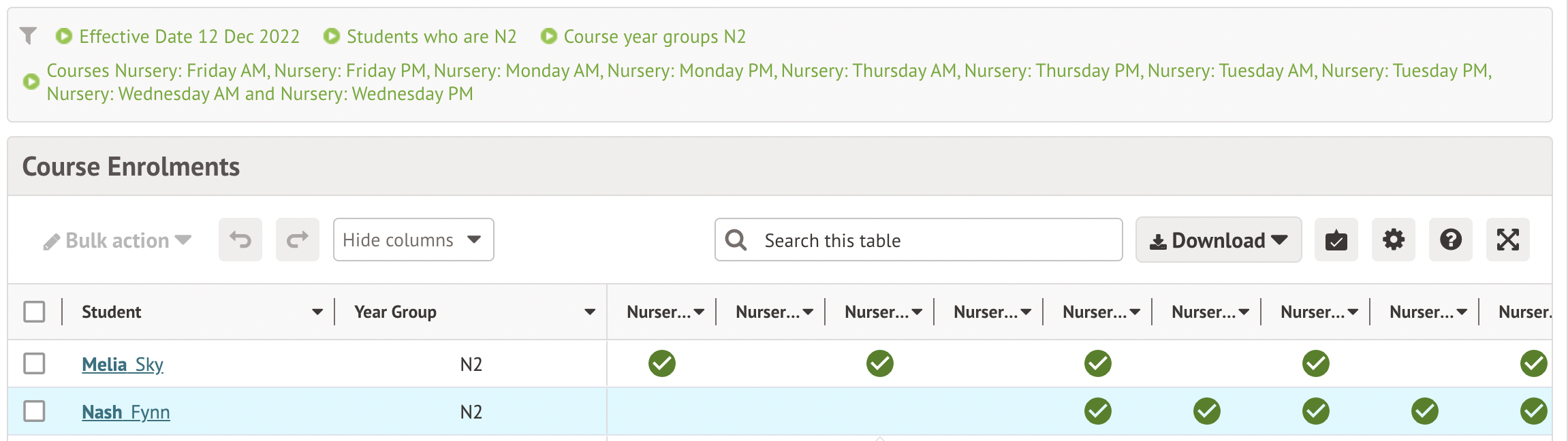 The students will then no longer be enrolled into those registers from the End date you select. You can check the students' enrolment has changed by using the date selector in the filters.