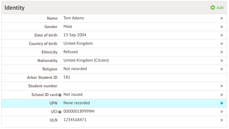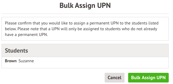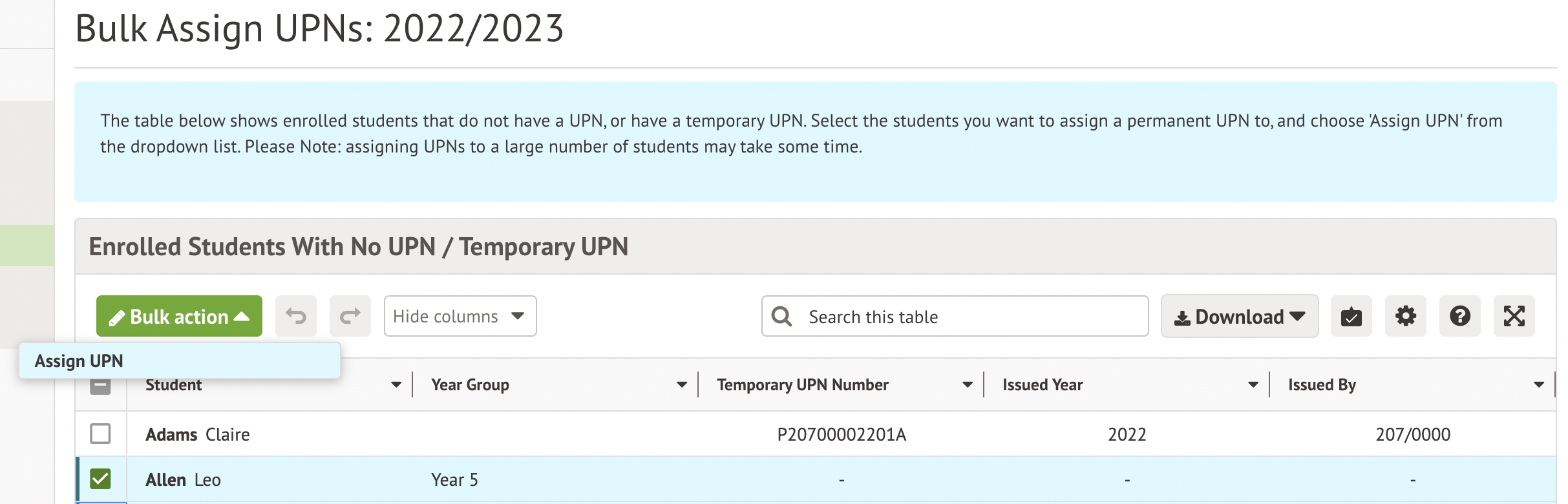 A Unique Pupil Number (UPN) for each student is collected every census. You can add existing UPNs or automatically assign UPNs to students from their Student Profile, or you can automatically assign UPNs in bulk. You may also refer to this as a Unique Pupil Reference Number or UPRN.