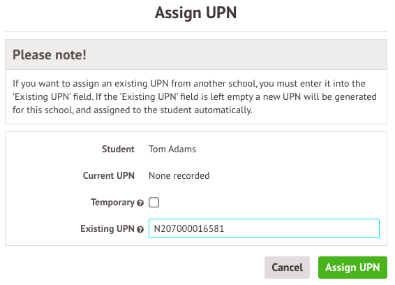 If a student already has a UPN logged, you may need to change it. This can happen if the student has been given a UPN when you didn't know their existing UPN, or if they have a temporary UPN that needs to be changed. Please follow these instructions: How do I change a UPN?