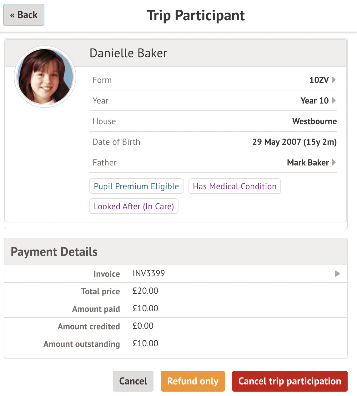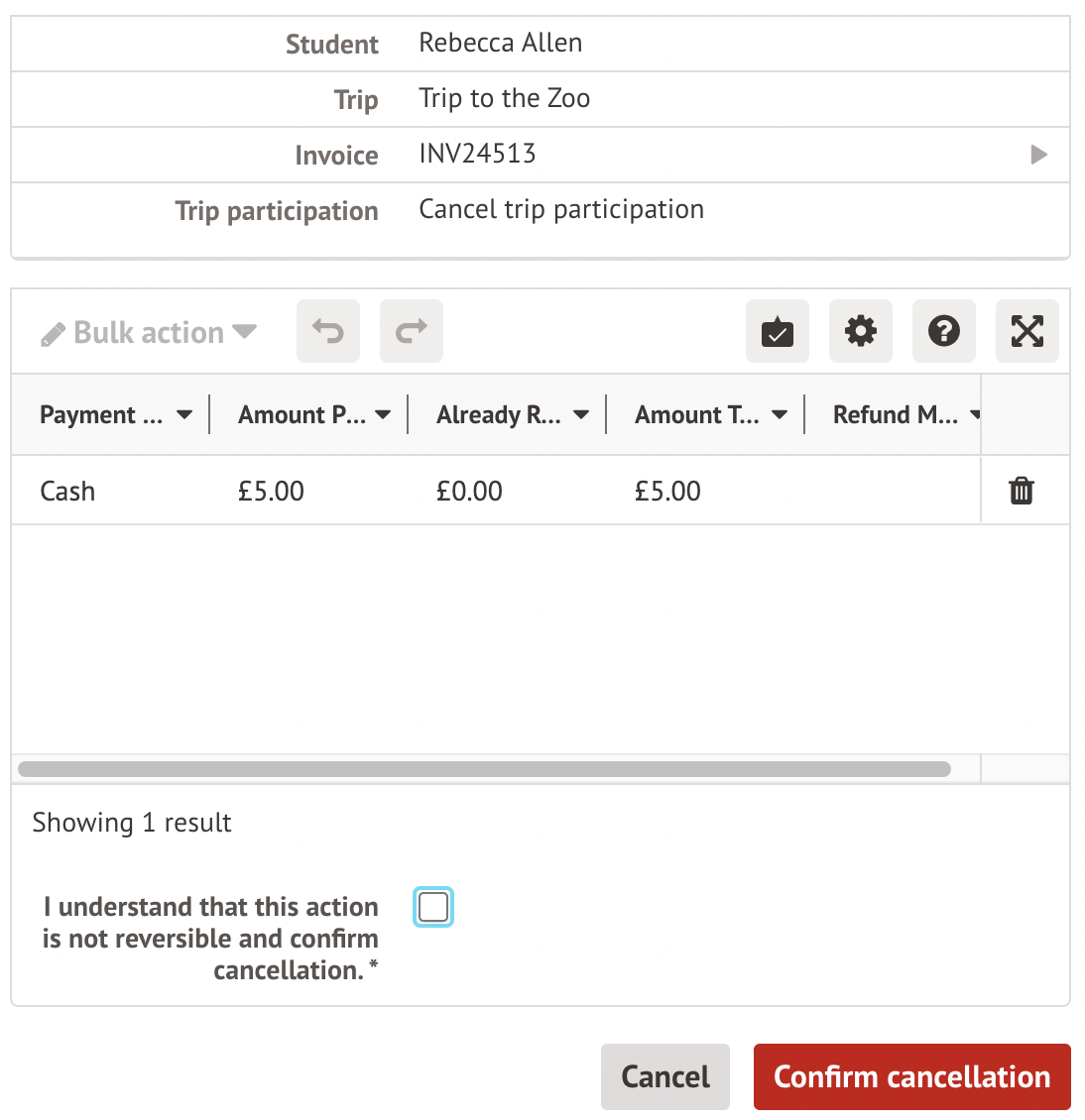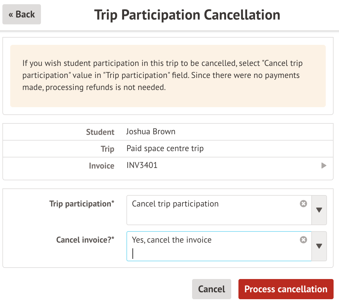 When selecting the child and cancelling their participation, you won't be able to select to refund any money, and you'll just be able to cancel the trip participation.