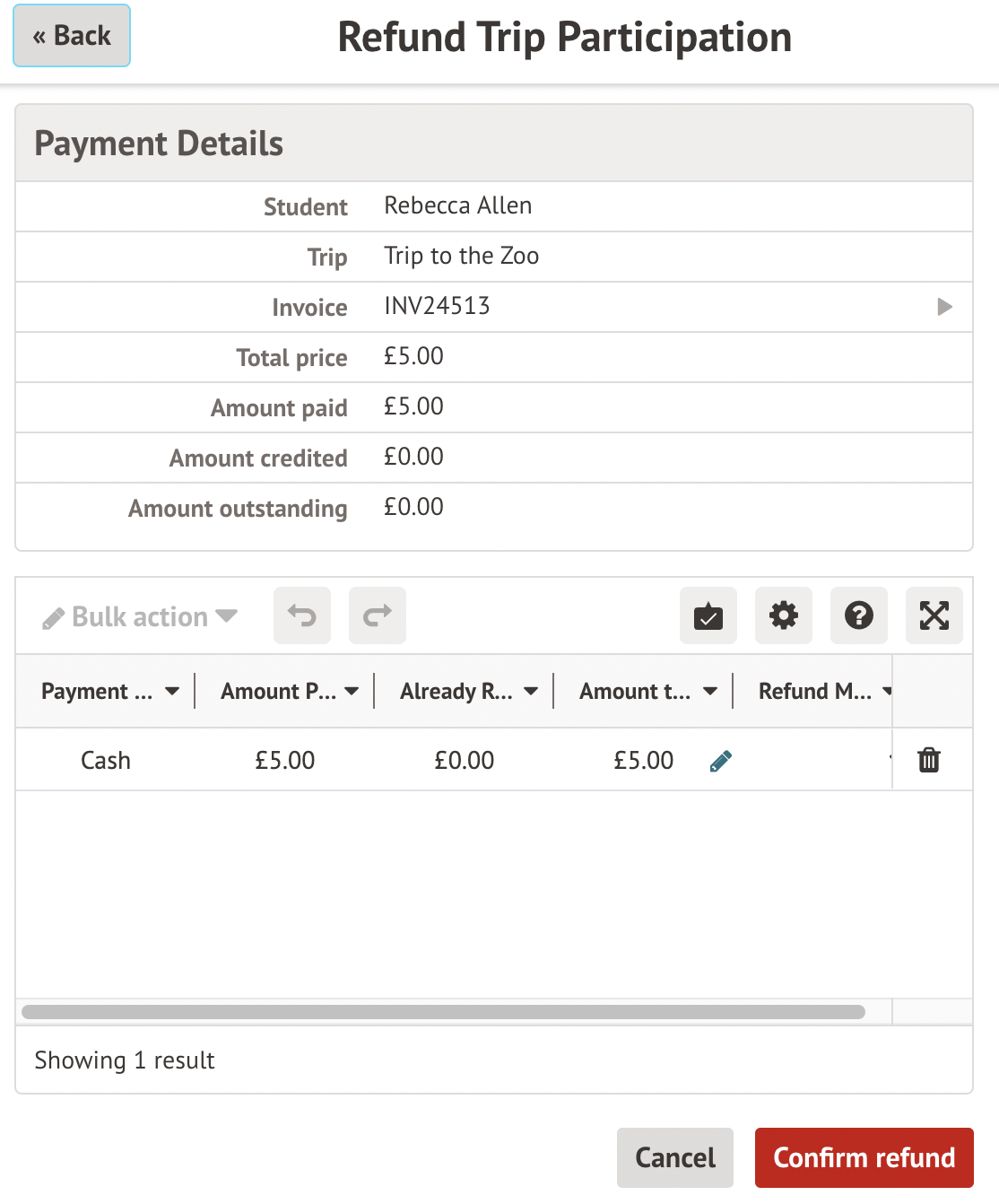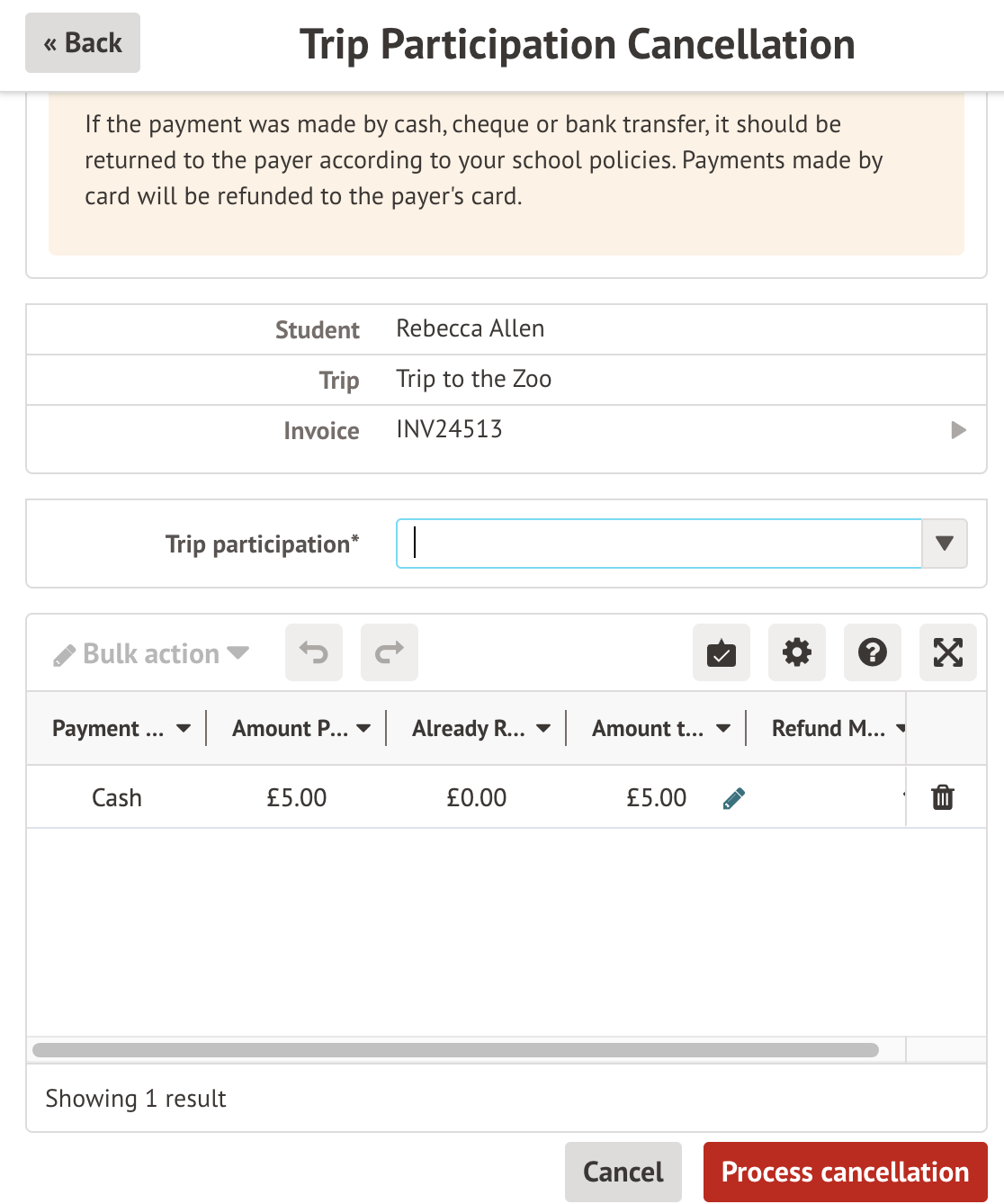 You can refund payments made by parents when signing their child up for a trip. Please note that it is not possible to do this in bulk for all students on a trip.