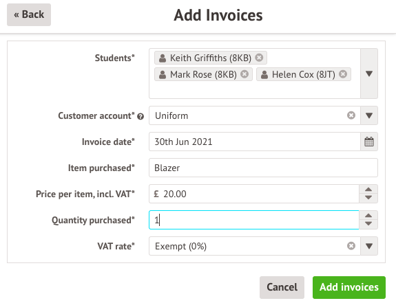 If you've set up any clubs or trips in Arbor, invoices are automatically generated when a partial payment is made. This could be when a parent signs their child up for a club or trip that allows voluntary payments, or no payments to be made towards it. You can manage these invoices from the clubs and trips pages. As such, you cannot generate ad-hoc invoices for clubs or trips.