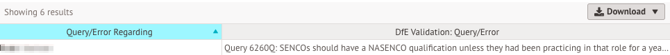 If you get Query 6260Q, this means your SENCO is missing a qualification that should be logged on your system. SENCOs should have a NASENCO qualification unless they had been practising in that role for a year or more prior to September 2009.