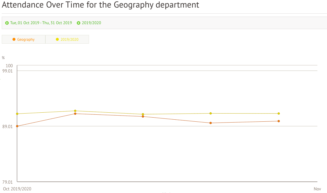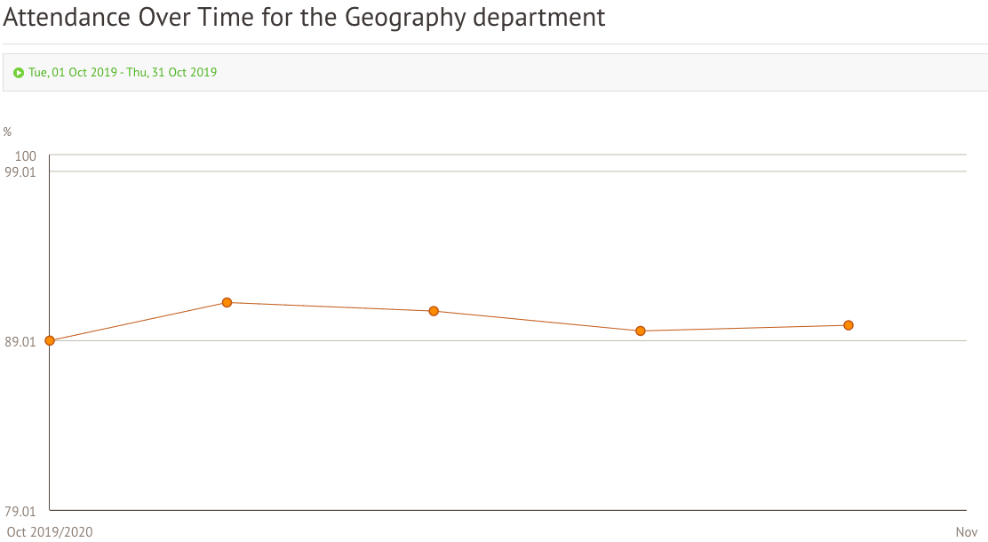 On the Attendance page, you'll be able to see the percentage of present lesson marks for your department over time.