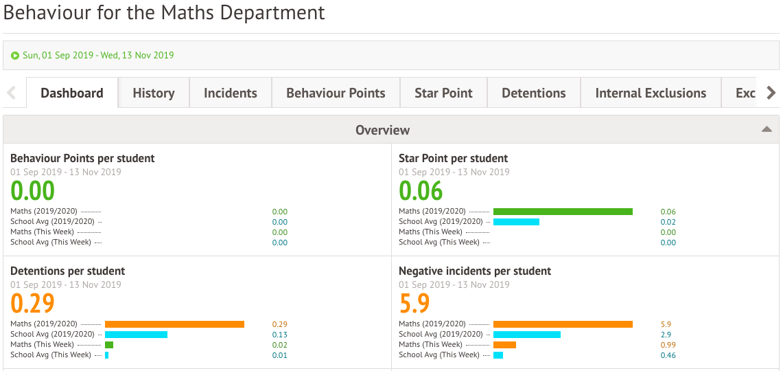 My Departments help you get a summary of the students and staff in your department, see the behaviour events and attendance in your department and compare this to whole-school averages. Just go to My Items > My Departments and select the department to view.