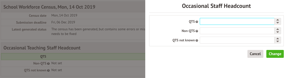 Just add in the numbers for qualified occasional teachers, unqualified occasional teachers and occasional teachers where it is unknown if they are qualified or not, then click Change.