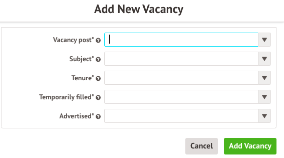 In the slide over, add in the vacancy details. In the Subject field, for the posts of Head, Deputy Head and Assistant Head the subject is not relevant, so you can select Not Applicable.