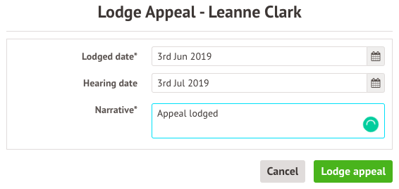 In the slide over, add in the lodged date, the hearing date if you know it, and a narrative, then click Lodge appeal