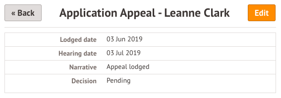 Once the appeal hearing has taken place, you can click on the appeal to add a resolution. In the slide over, click the orange Edit button.