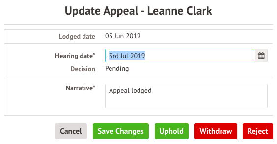 You can then log whether the appeal was upheld, withdrawn or rejected. Select one of the options, or select Cancel to make no changes.