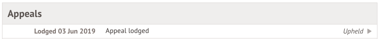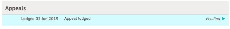 The bottom of the Application Overview page will then show the appeal as lodged and Pending.