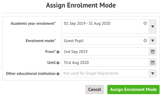 In the slide over, change the Enrolment mode to Guest Pupil, change the dates to cover the whole academic year, then click Assign Enrolment Mode.