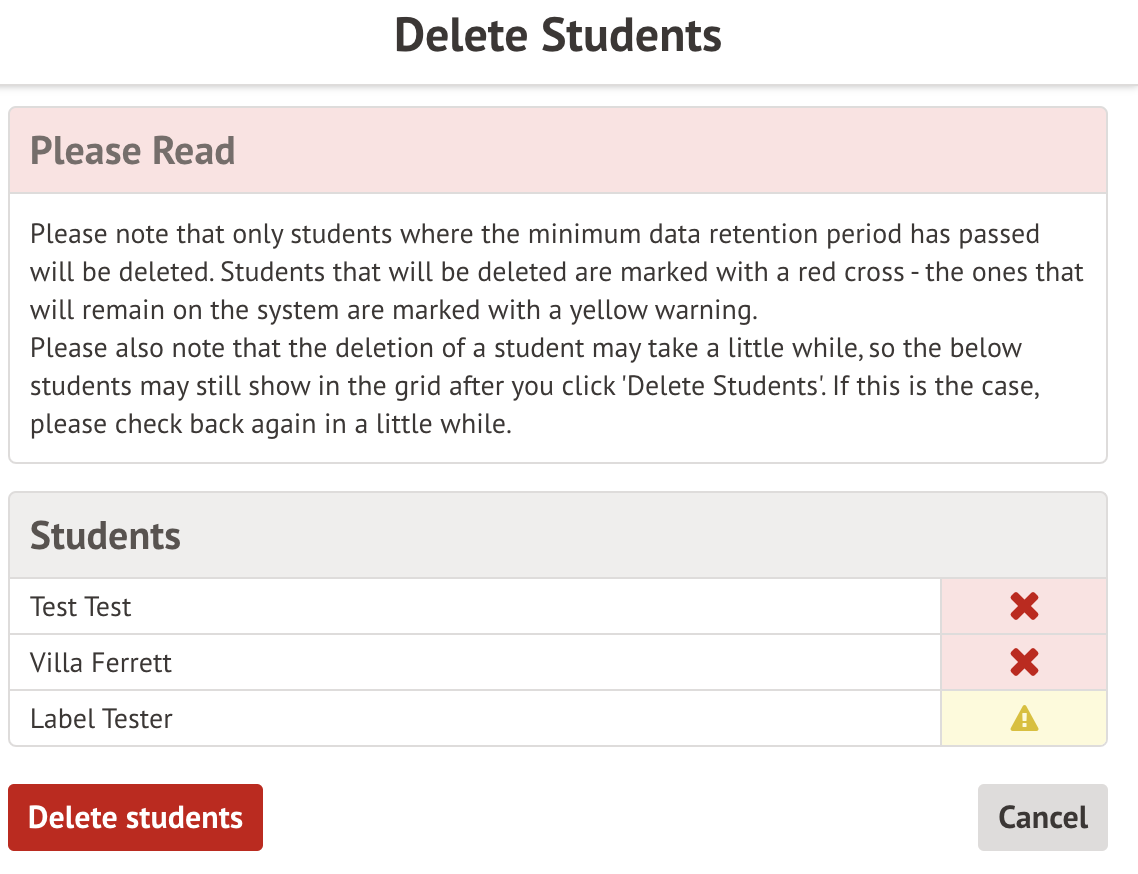 Students who will be deleted will be marked with a red cross.