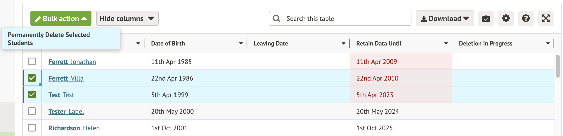 Any students who are possible to delete in bulk are flagged in red.