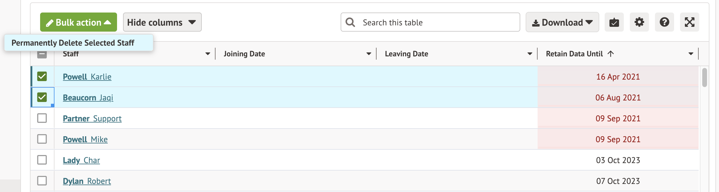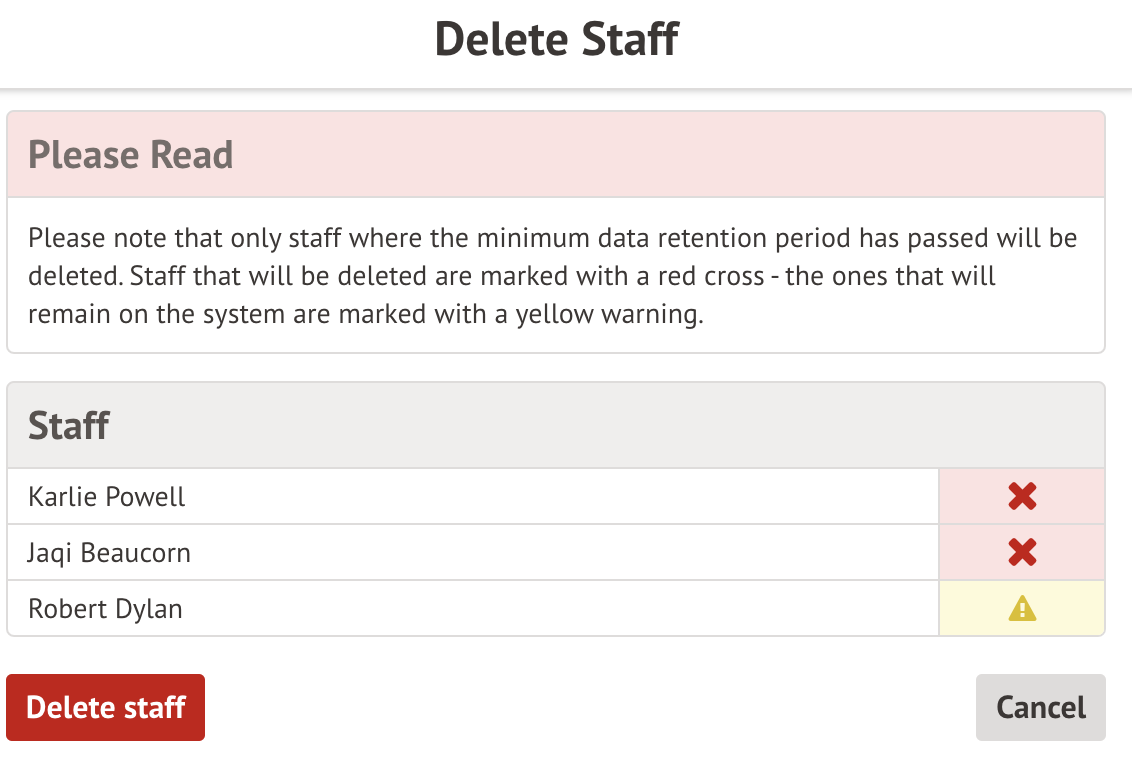 Staff that won't be deleted will be marked with a yellow flag - this is because the data retention period has not yet been reached. You'd need to use the alternate method outlined below to delete them.